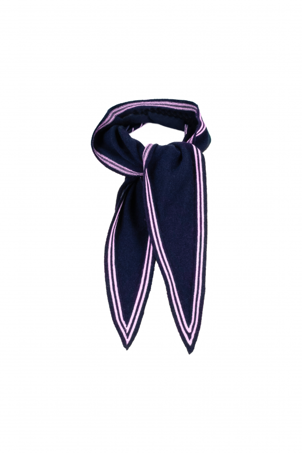 The design is all in the proportions: two tapered points and a neat central knot that flatters without bulk. A contrast fine stripe border frames the scarf and draws the eye to the tie, giving a subtle graphic finish whether you wear it tight to the collar or loosened and draped. At length 125cm, Bontie is long enough to knot, bow, loop or tuck with ease—lightweight for indoors, warm enough for chilly commutes.